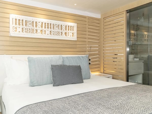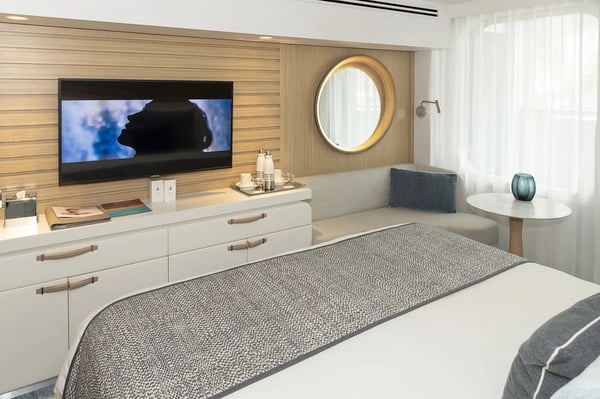 Elegant and light-filled, the Deluxe Stateroom features a private balcony, queen-size bed, ensuite bathroom and refined contemporary décor, offering a comfortable and stylish retreat after days of exploration.