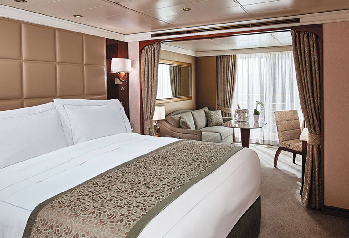 The top-tier Regent Suite on Splendor and Grandeur spans over 400 square metres (4,400 sq ft) and includes two bedrooms, a living room, a private spa, and two balconies. It holds the title of the largest suite at sea.