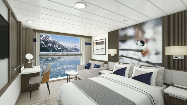 Spacious mid-deck rooms with large picture windows offering natural light and ocean views.