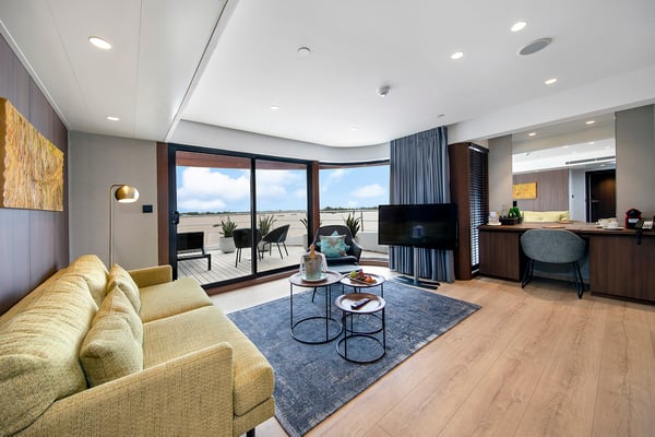 The most luxurious accommodation onboard, this elegant suite features a separate bedroom and living area, walk-in wardrobe, large balcony and generous bathroom. Enjoy included extras, exclusive amenities and exceptional space throughout your cruise.