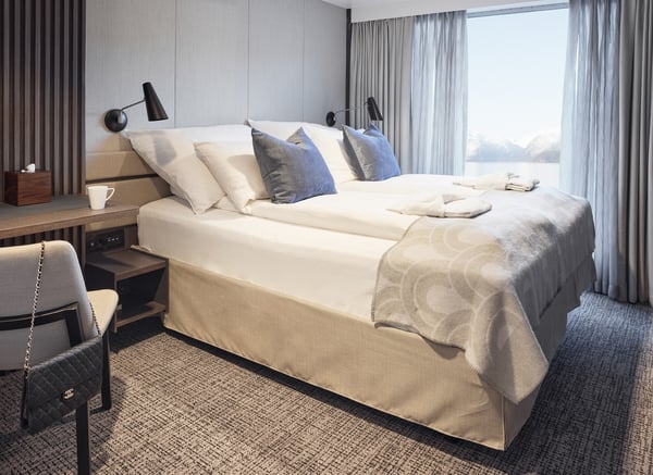 On board our new coastal cruise ships, the emphasis is on providing passengers with spacious cabins. Our cabins are intended to be pleasant places to relax during the day and sleep well at night. The typical Nordic décor reflects the landscape through which you will be sailing.