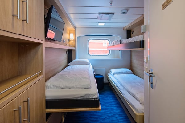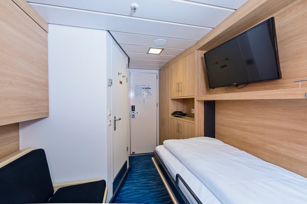 These comfortable, outside cabins for up to three people on the upper or middle decks have separate beds, one of which converts into a sofa. The cabins have limited or no view.
