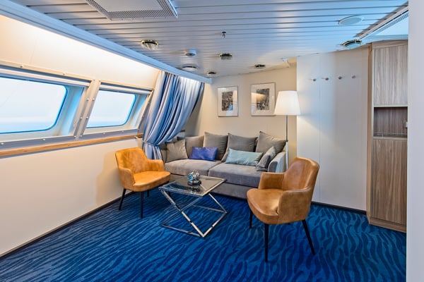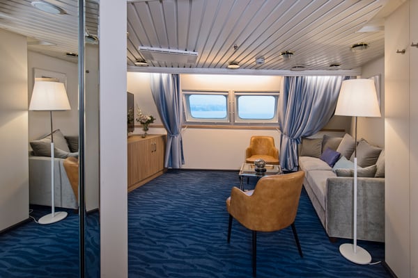 These elegant, refurbished suites are situated on the upper deck. They feature a separate bedroom, double bed, sofa in the sitting area that can be made into a double bed, free Wi-Fi, TV, hair dryer, bathrobes, blanket, and coffee and tea facilities.