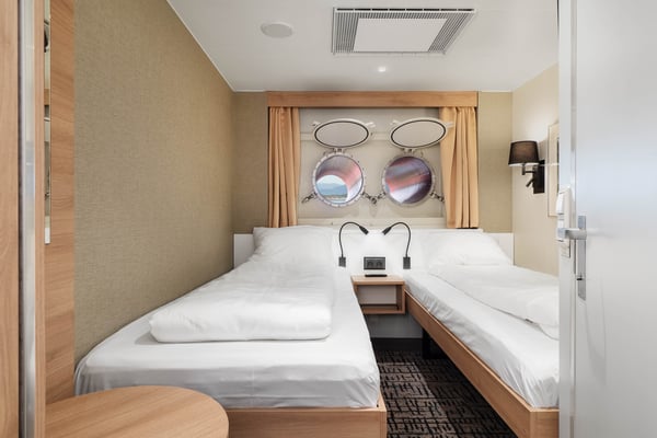 These are comfortable outside cabins, situated on lower decks. They have separate beds, where one of the beds can be turned into a sofa. These are cabins with portholes, some with limited or no view.