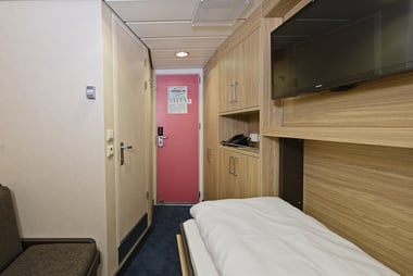 These comfortable, standard inside cabins for up to two people on the middle deck have bathrooms with shower/WC, and separate beds, one of which converts into a sofa.