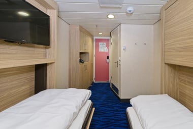 These standard outside cabins for up to two people on the middle decks have separate beds and bathrooms with shower and WC.