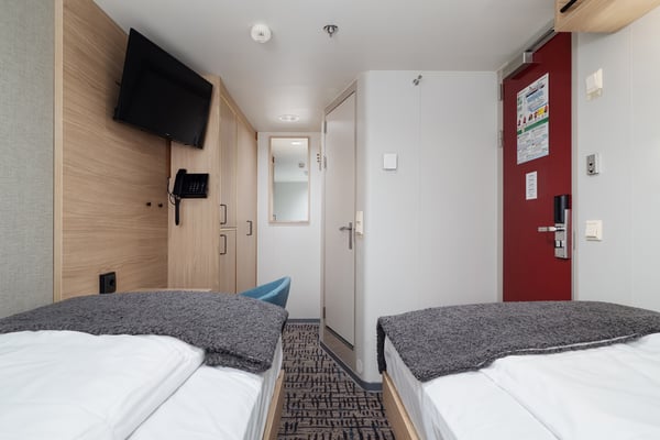 These comfortable inside cabins for up to two people on the lower deck have twin beds, a chair, TV and a hairdryer.
