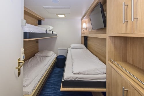 These superior inside cabins for up to three people on the upper deck are newly refurbished and have bathrooms∘ with shower/WC. The cabins have TV and separate beds, one of which converts into a sofa. The third bed is an upper berth.