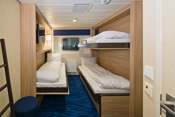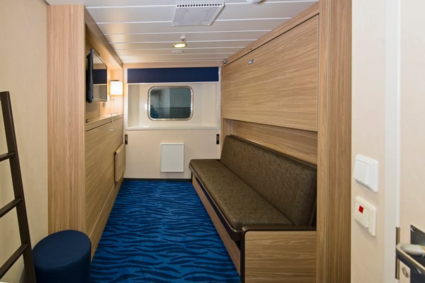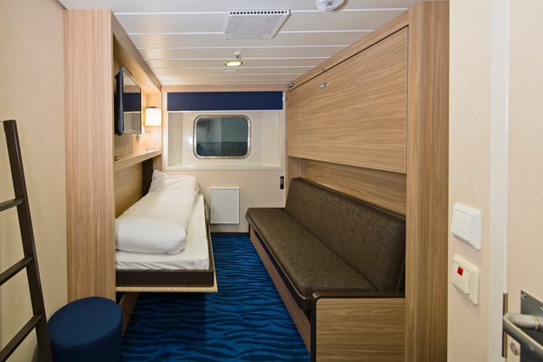 Refurbished outside cabin for up to three people, with a single bed/sofa and two pullman beds. The cabin comes with a TV, and has a full view.