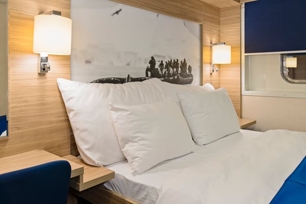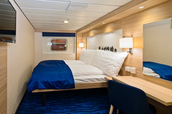 Refurbished arctic superior cabin for 2 people on upper decks. The cabin comes with a double bed, full view, chair, desk and TV.