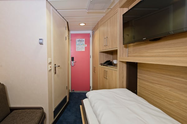 These comfortable inside cabins for up to two people on the upper deck have separate single beds, one of which converts into a sofa, TV, and a hairdryer.