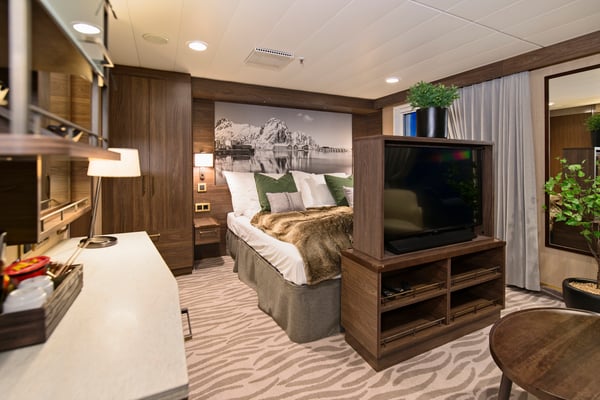These comfortable, refurbished suites for up to four people have double beds. Some have a sofa bed, chairs, and minibar. Suites also include Wi-Fi, TV, hairdryer, bathrobes, blanket, and coffee and tea facilities. Please note that cabins 601 and 602 have two smaller windows.