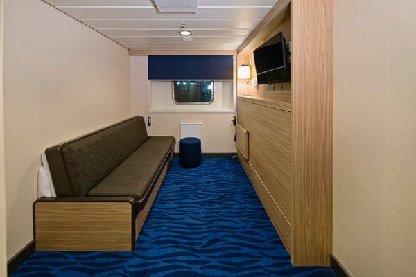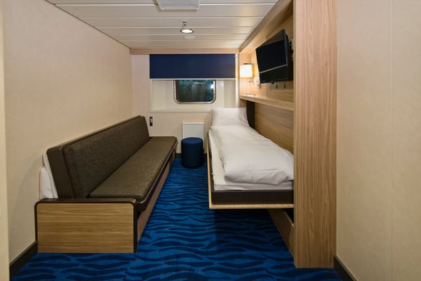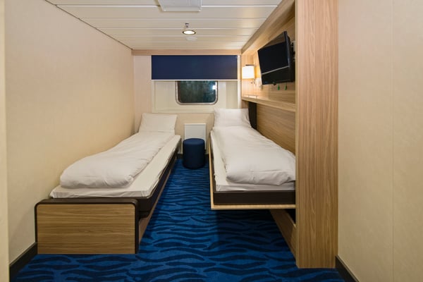 These comfortable outside cabins for up to two people on the lower deck have separate beds, one of which converts into a sofa. The cabins have a TV, chair, and portholes, some with limited or no view.