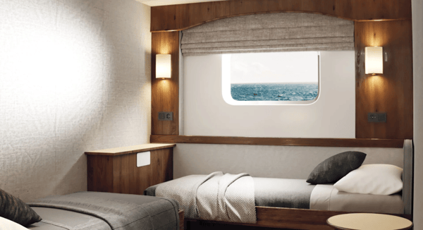 These standard outside cabins for up to two people have separate beds, one of which converts into a sofa.