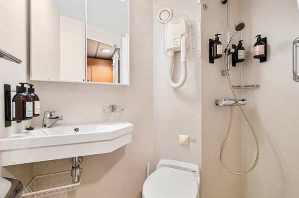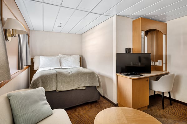 These large, comfortable cabins have small double beds, and all have sofa groups and a fridge with minibar. The cabins have very limited or no view.