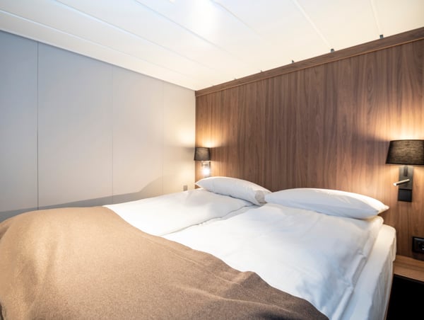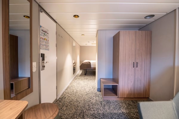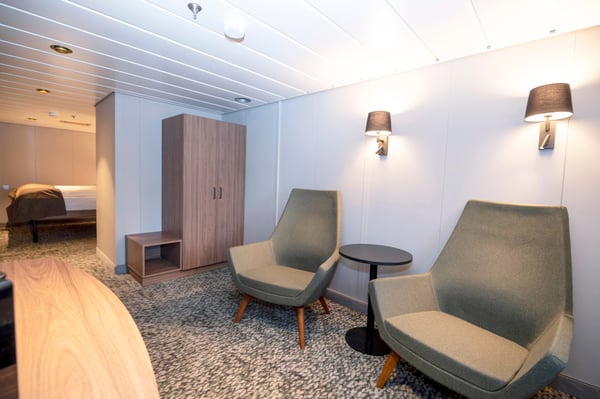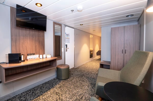 These refurbished suites situated on the upper deck have separate bedroom, double bed, chair, TV, and coffee and tea facilities.