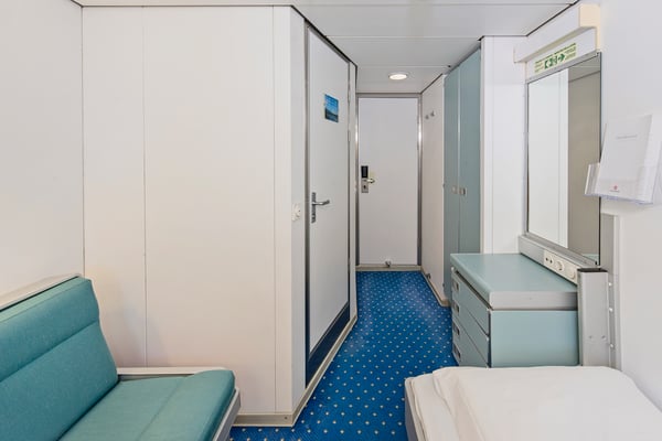 These standard outside cabins for up to 2 people on the middle decks have bunk beds, one of which converts into a sofa, and a chair.