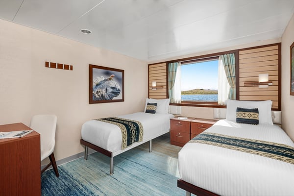 #201, 202 – All cabins face outside with a large window, two single beds that can convert to a queen-sized bed. Furniture includes an armchair, desk, two nightstands, and a closet.