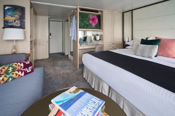 280 sq. ft. with two panoramic windows, twin/king convertible beds, a seating area with a sofa, a lounge chair, and marble double-sink bathrooms with a rain shower.