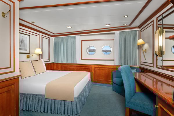 #301, 322, 323 — These solo cabins feature a window or two portholes, a queen-size bed, except for #301, which has a double bed, writing desk and chair, climate controls, reading lamps, coffee table, two bedside tables, and a TV. Marble bathrooms are generously sized and include a roomy shower stall with a glass door.