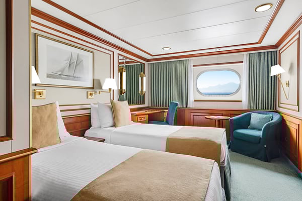 #302-312, 314, 315, 317 — Cabins feature an oval window and configurable beds, consisting of two single beds that can be converted into a queen bed. An armchair, reading lamps, a flat screen TV, a bedside table, a coffee table, a desk, and climate controls complete the amenities. Marble bathrooms are generously sized and include a spacious shower stall with a glass door.