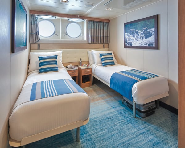 #301-306 — Cabins feature two single beds that can convert to a Queen, a writing desk, two nightstands, two portholes, a full-length mirror, and reading lights.