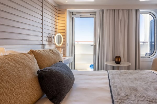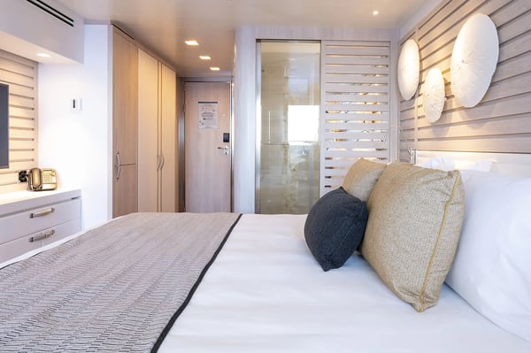 Elegant and light-filled, the Deluxe Stateroom features a private balcony, queen-size bed, ensuite bathroom and refined contemporary décor, offering a comfortable and stylish retreat after days of exploration.