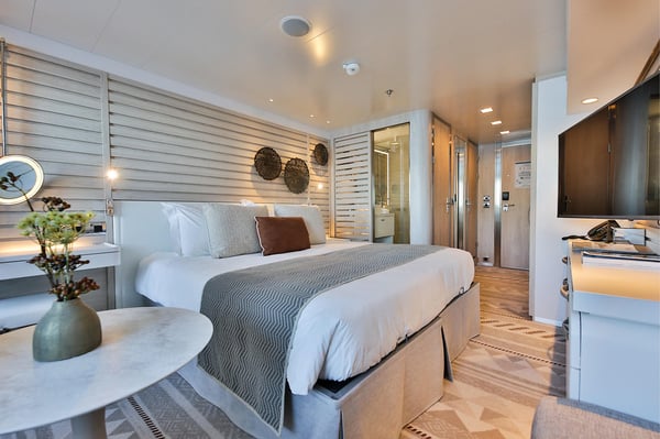 Elegant and light-filled, the Deluxe Stateroom features a private balcony, queen-size bed, ensuite bathroom and refined contemporary décor, offering a comfortable and stylish retreat after days of exploration.