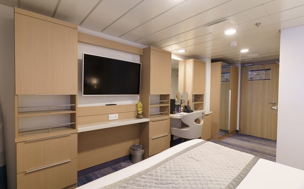 Designed for one. These cabins are located on Deck 3 and are approximately 166 sq. ft. (15.4 sq. m) in size, featuring one double bed and a porthole view. There is also a desk and chair, a TV, a state-of-the-art ‘infotainment’ system, and a private bathroom with a shower, vanity, and heated floor.