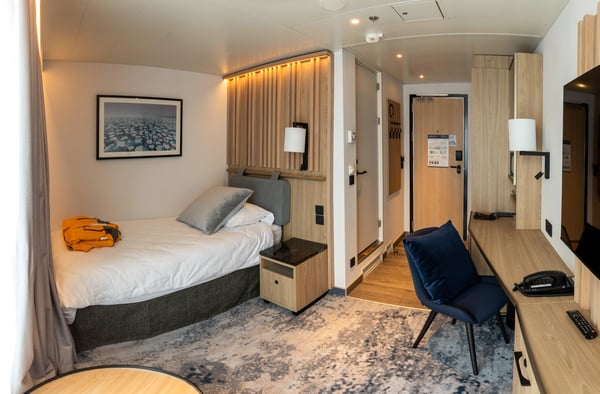 Ultramarine’s suites combine contemporary design with expedition-ready comfort. Light and inviting, they feature heated floors, spa-style bathrooms and smart storage for gear. Many offer private balconies or panoramic windows for breathtaking views. After a day of adventure, unwind in Scandinavian-inspired serenity with blackout curtains, premium toiletries, and high-speed WiFi, offering the perfect balance of luxury and exploration.