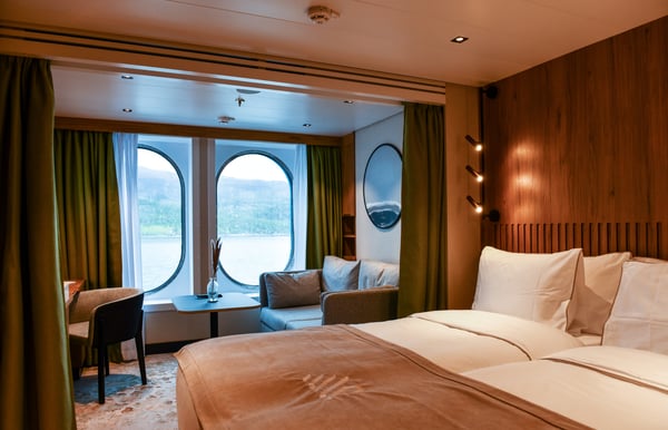 Oceanview Staterooms feature two single beds or a double bed, a bedroom with living room area, and a luxurious bathroom.