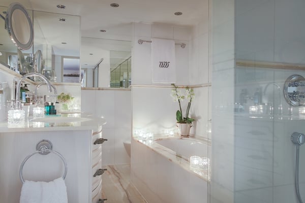 The Grand Suite offers extra benefits, including a separate spacious living room, bathroom with a separate rain shower and tub, and secluded toilet and bidet area
