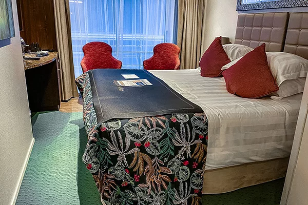 We were allocated Cabin 231, a French Balcony stateroom on Deck 2 towards the aft. While not overly spacious, the room is well-designed, featuring a queen-sized bed, crisp white linens, and floor-to-ceiling sliding glass doors that let in plenty of light and fresh air. The bathroom featured a rainfall shower and high-quality toiletries, and there was ample hanging and shelf space in the wardrobe. Small touches, such as complimentary bottled water, umbrellas, and a daily turndown service, made the stay feel thoughtful. There was even the option to change to sheets if preferred.