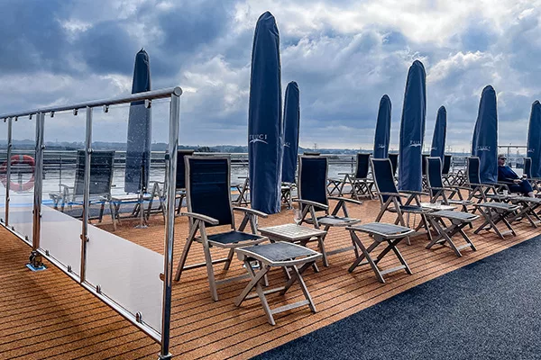 Some thoughtful features I particularly liked included complimentary postcards left for you at reception, hiking sticks for shore excursions, and reading glasses available if needed. The pool is open into the night, and while the swim-up bar was not used much, the space itself added to the ship’s relaxed charm.