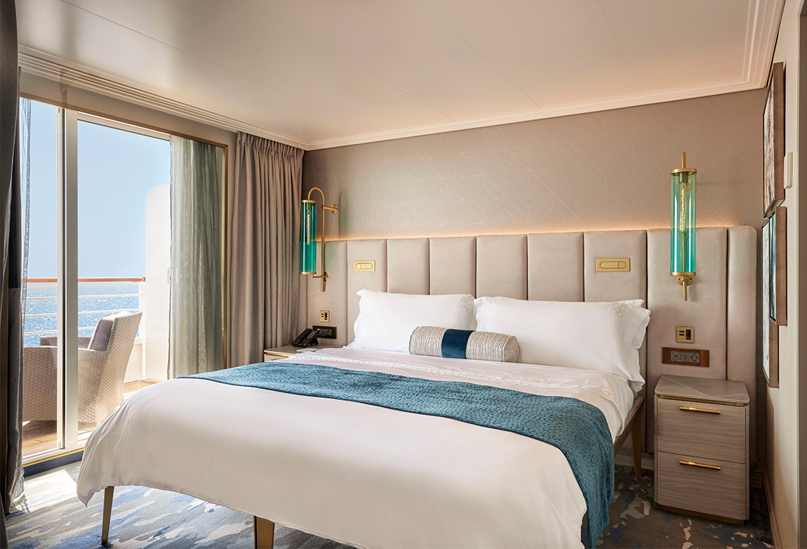 The suite opens onto a generous balcony, accessible from both the lounge and bedroom. While it did not come with a lounger as standard, one was available on request. Thoughtful touches included Ortigia Sicilia toiletries, a fridge drawer, and a coffee machine. An iPad allowed us to contact our butler, make reservations, and more, anywhere onboard. Champagne welcomed us on arrival, and guests can even pre-order a full-sized spirit bottle for their suite.