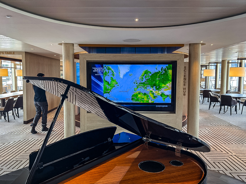 At the opposite end of the deck is Charlie Green’s Bar and Restaurant, named in honour of the chef who prepared Ernest Shackleton’s final meal before his Antarctic expedition. Serving light bites, snacks, and the occasional Afternoon Tea, the space is bright and welcoming, thanks to floor-to-ceiling windows and elegant, modern furnishings. It also hosts Charlie’s Table – an exclusive multi-course dining experience for a select number of guests – and the Science Hub, where visitors can observe resident and guest scientists conducting research in real time.