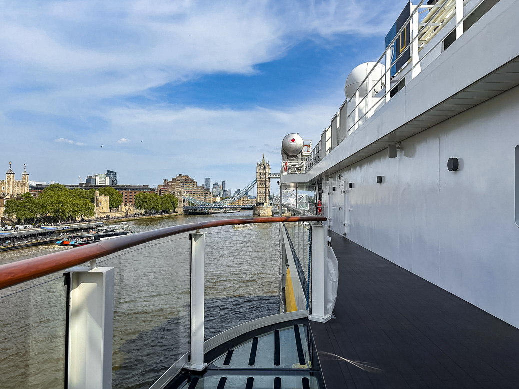 On Decks 6 and 7, we explored some of the ship’s accommodation – and this is where things got really interesting. The suites and staterooms are genuinely impressive. I wasn’t quite sure what to expect, but the interiors lean more towards understated luxury than the sparser layouts you might find on traditional expedition ships. Every cabin offers outside views, either through a balcony or a large window, and comes with an ensuite bathroom and plenty of charging points (don’t make the same mistake I did – bring an adaptor! A true rookie error from someone who’s worked in travel for 20 years…)