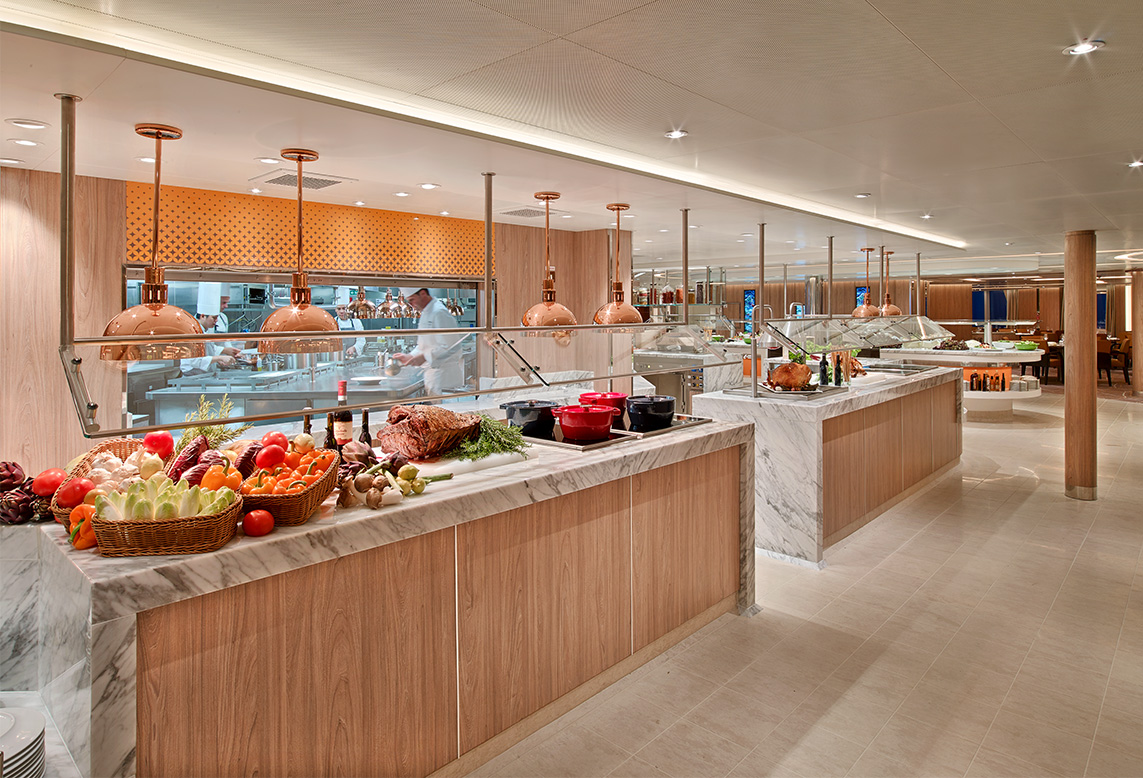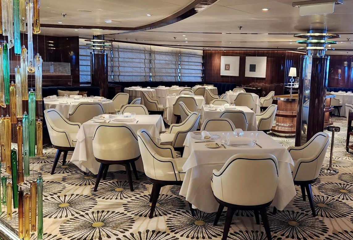 The Restaurant is the ship’s primary dining room, designed by Adam D. Tihany with a dramatic, high-ceilinged aesthetic. It operates on an open-seating basis, meaning you can dine whenever you choose between 7pm and 9pm and with whoever you wish. The menu is a blend of classic international cuisine and contemporary dishes, always accompanied by complimentary fine wines and champagne.