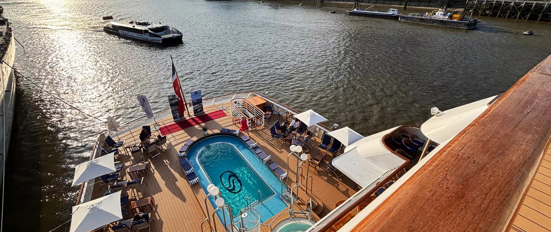 In terms of layout, Deck 2 is home to the retractable watersports marina (though not much use on the Thames, sadly), as well as the dining salon – the ship’s main restaurant. Deck 3, where guests are welcomed with a glass of champagne, features the pool bar, swimming pool, card room, and the onboard boutique.