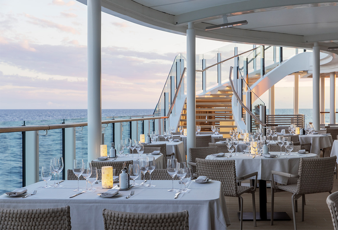 The main dining room on every Silversea ship. Open for breakfast, lunch, and dinner, with an à la carte menu that changes daily. The atmosphere is formal enough to feel special but relaxed enough to linger. Single, double, and larger tables are available. No fixed seating times and no assigned tables, so you eat when you want and with whom you choose.