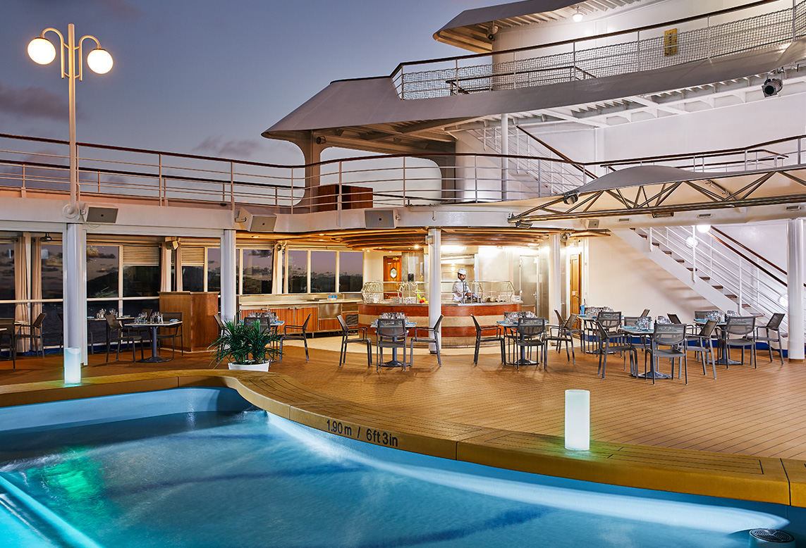 Burgers, grilled fish, salads, and lighter fare served in an outdoor setting. Available at lunchtime and popular on sea days. The least formal dining option on most ships and a practical choice when the dress code is the last thing you want to think about.